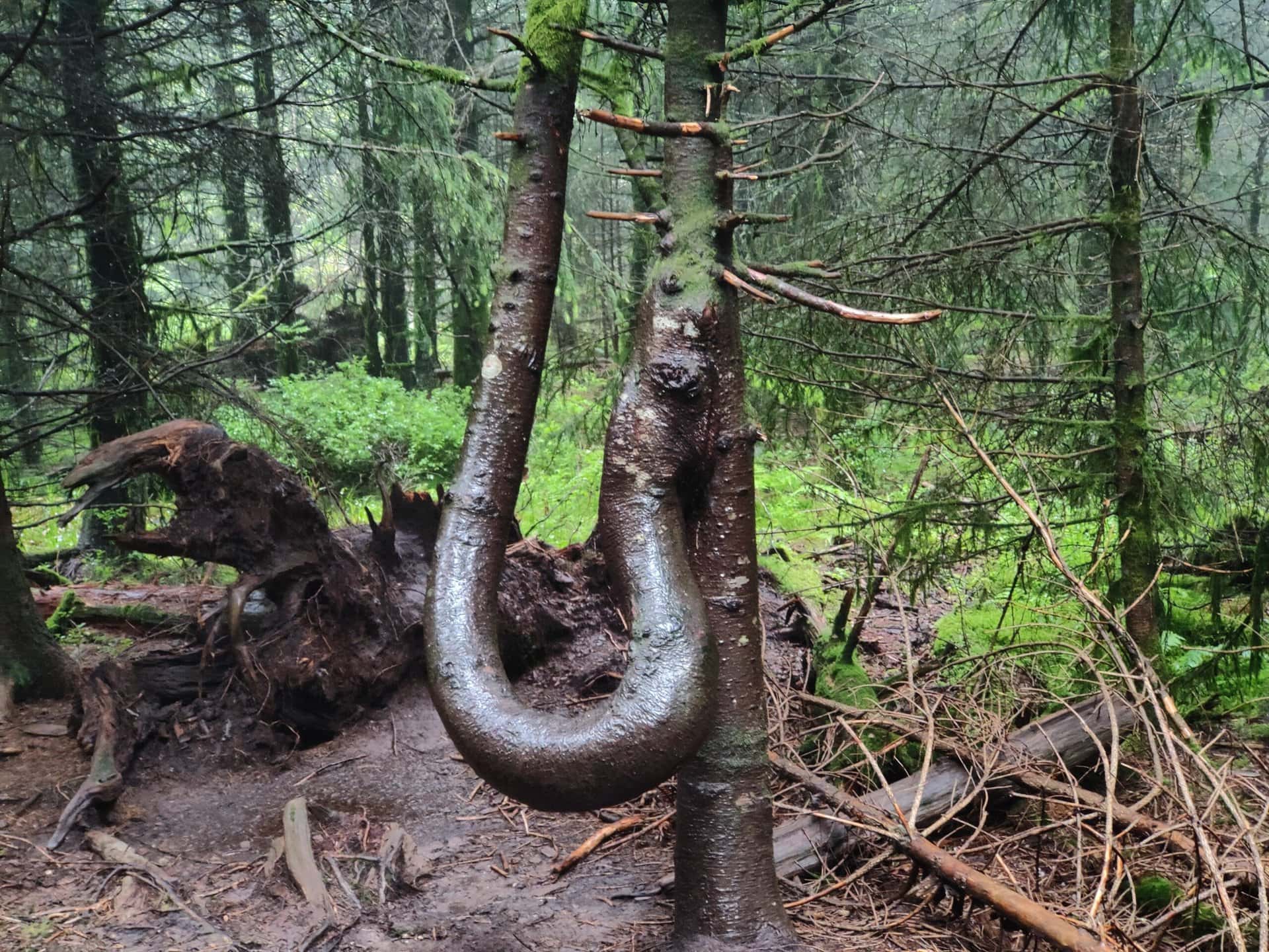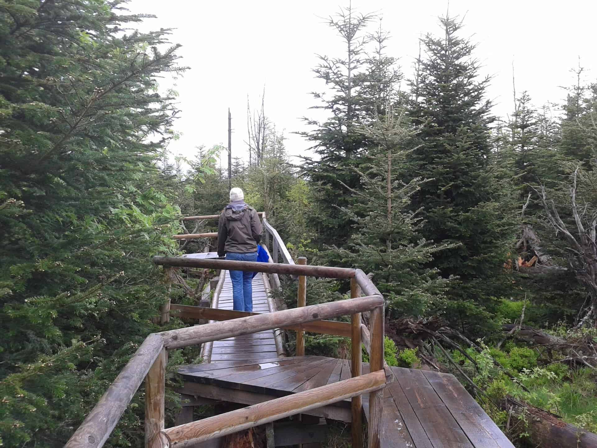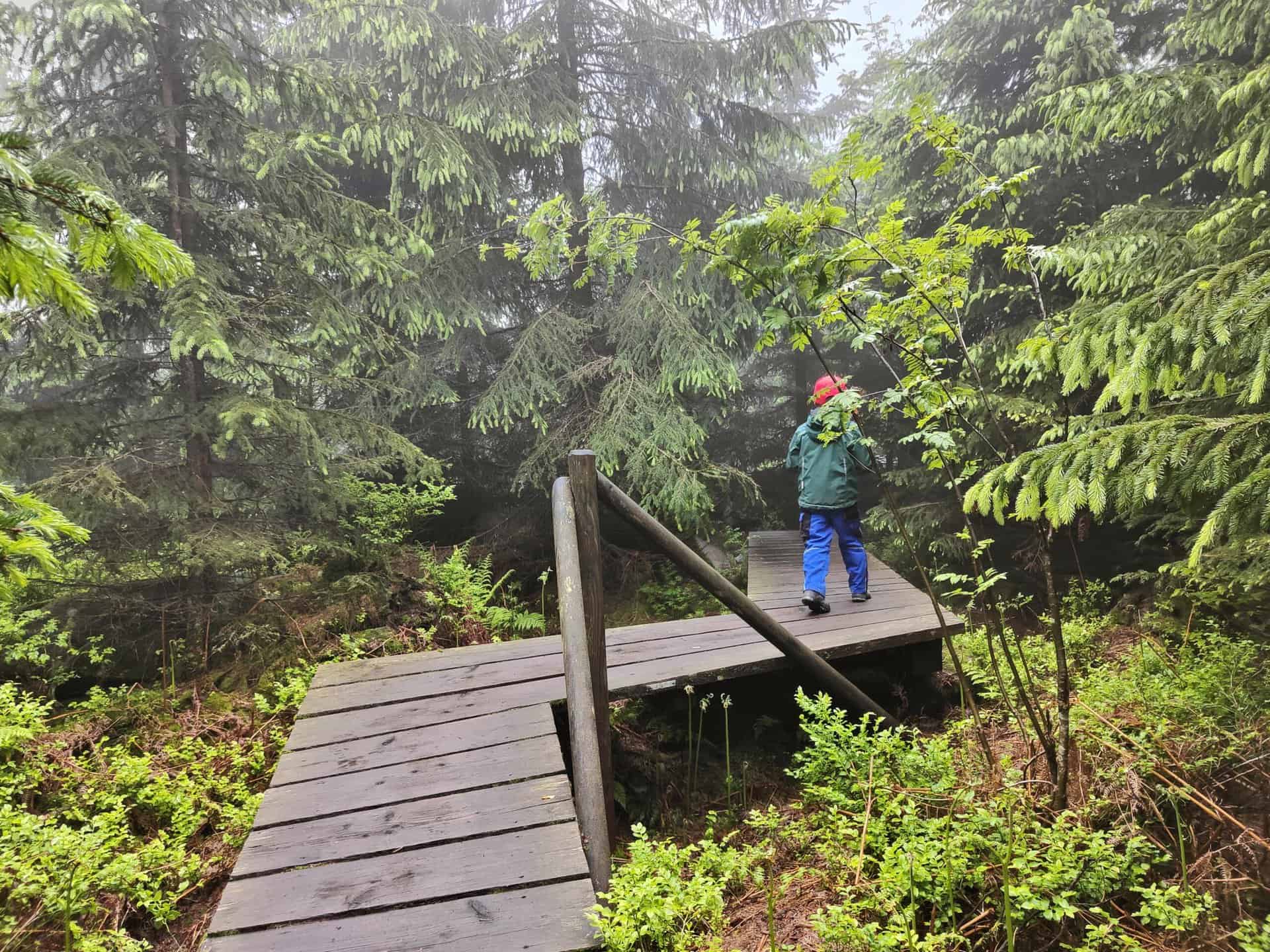 Der Pfad verläuft größtenteils auf Holzbohlen und führt mit kleinen Brücklein über oder unter das Sturmholz.