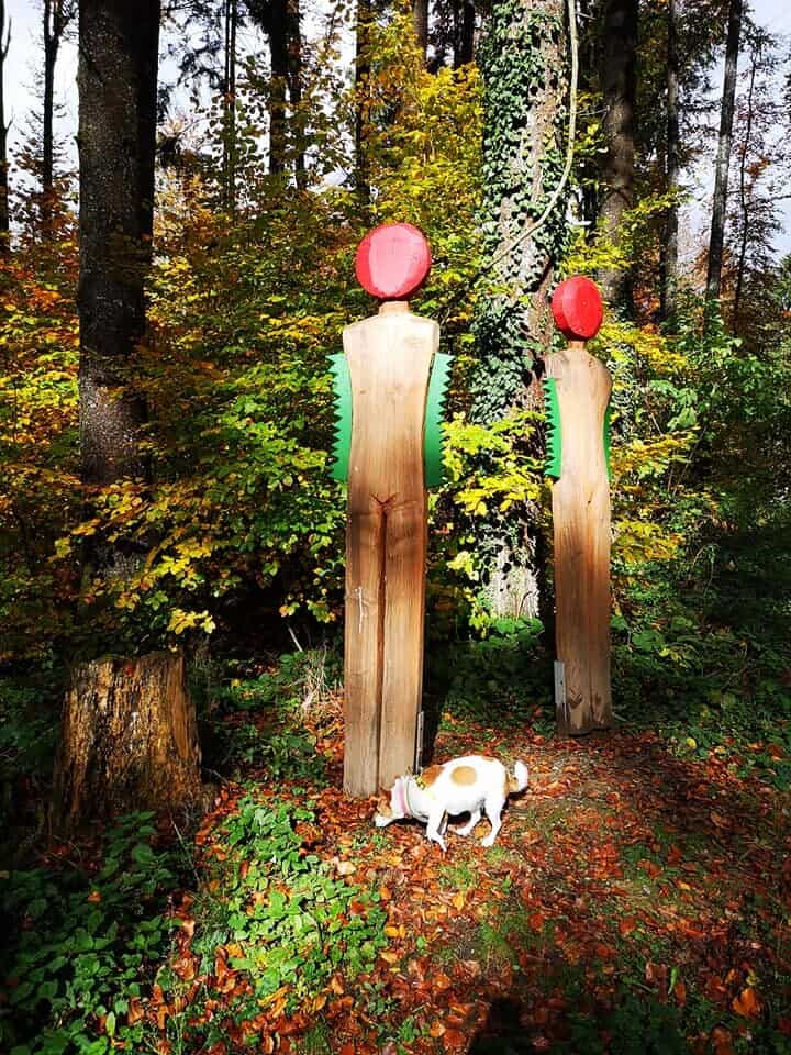 Vom Parkplatz aus geht man direkt durch das Eingangsportal auf den Erlebnispfad. Von hier folgt man immer weiter den Eibi-Wegweisern. Kurz nach dem Eingang sieht man noch junge Bäume, die vom Förster bewirtschaftet werden. Nachdem man links abgebogen ist, kommt man schon zur ersten richtigen Mitmachstation. Hier kann man sich im Schätzen der Länge des Baumes üben.